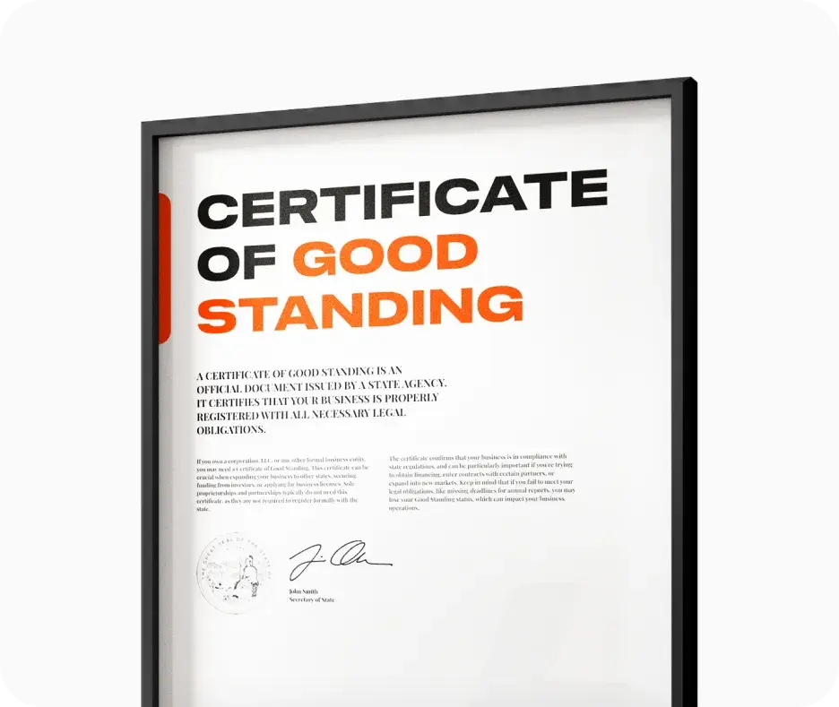 A Certificate of Good Standing (also called a Certificate of Existence or Certificate of Status in some states) is an official document issued by your state government that verifies your business is legally registered, up to date on all required filings, and in compliance with state regulations.